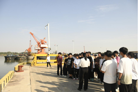 抵达周口中心港后,新生们首先被港口的宏大规模和繁忙景象所震撼。在港口工作人员的引导下,他们参观了港口的各个功能区,包括货物装卸区、仓储区、船舶停靠区等,详细了解了港口作业流程、设备操作及安全管理等方面的知识。