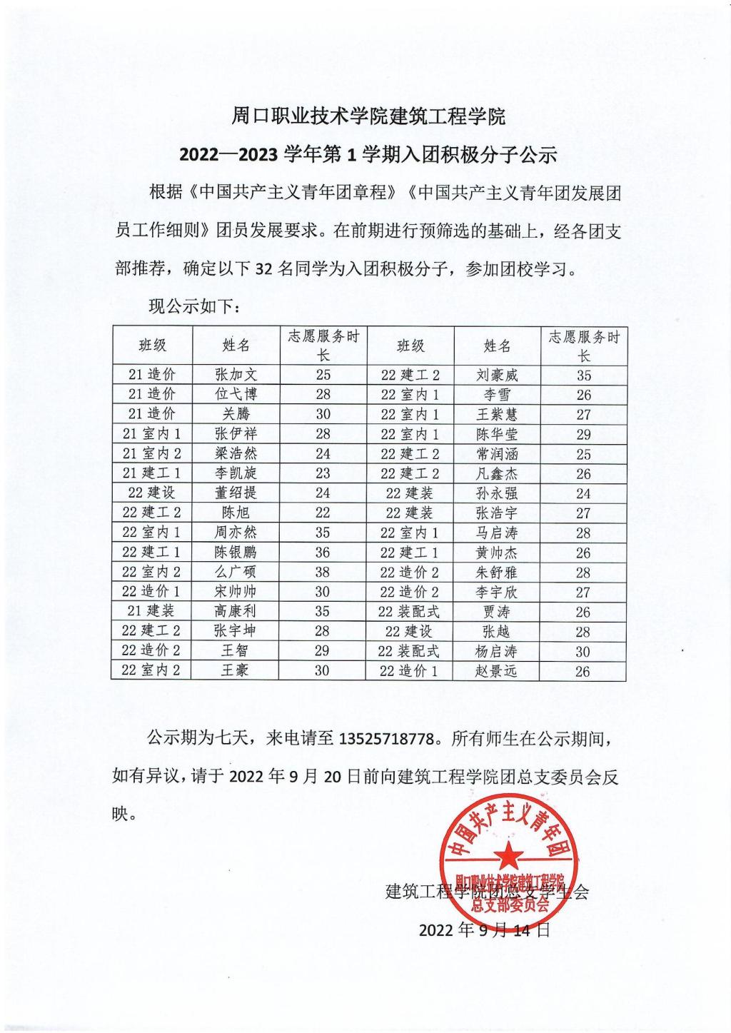 建筑工程公司2022-2023学年第一学期入团积极分子公示