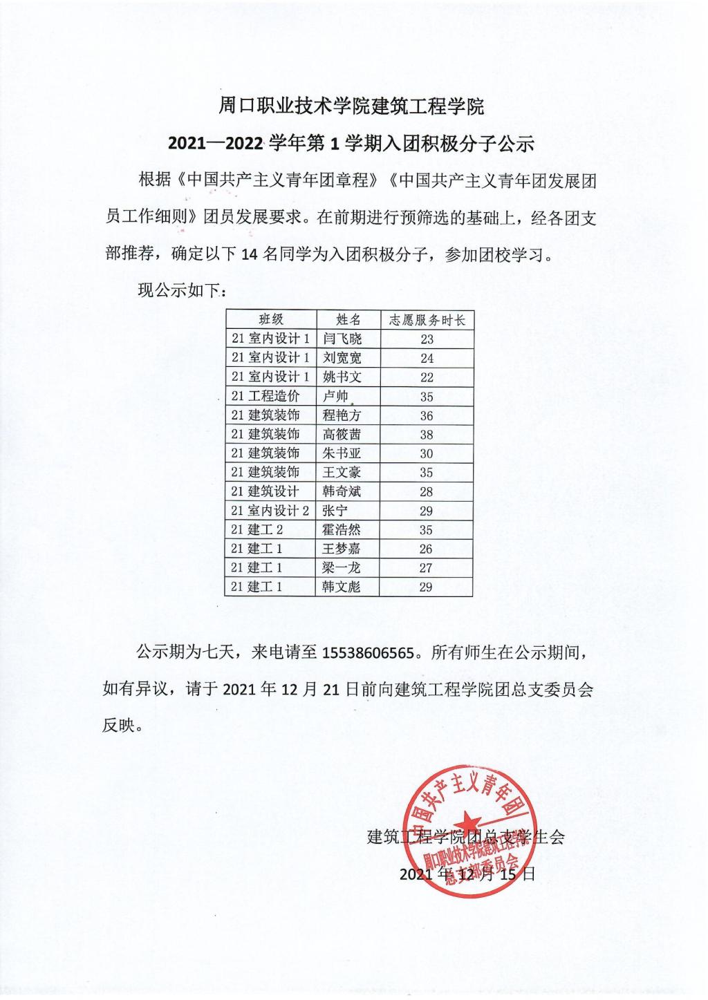 建筑工程公司2021至2022学年第一学期入团积极分子公示