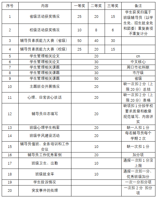 辅导员是高校教师队伍的重要组成部分,是老员工思想政治教育和管理的骨干力量,是老员工健康成长的指导者和引路人。为切实加强辅导员队伍的建设,建立良性的工作竞争和激励机制,坚持过程评价与目标评价相结合、工作能力与研究能力相结合、自我评价与组织考核相结合的原则,力求公开、公平、公正,结合bw必威西汉姆联官方网站辅导员队伍建设实际,特制定本管理办法。